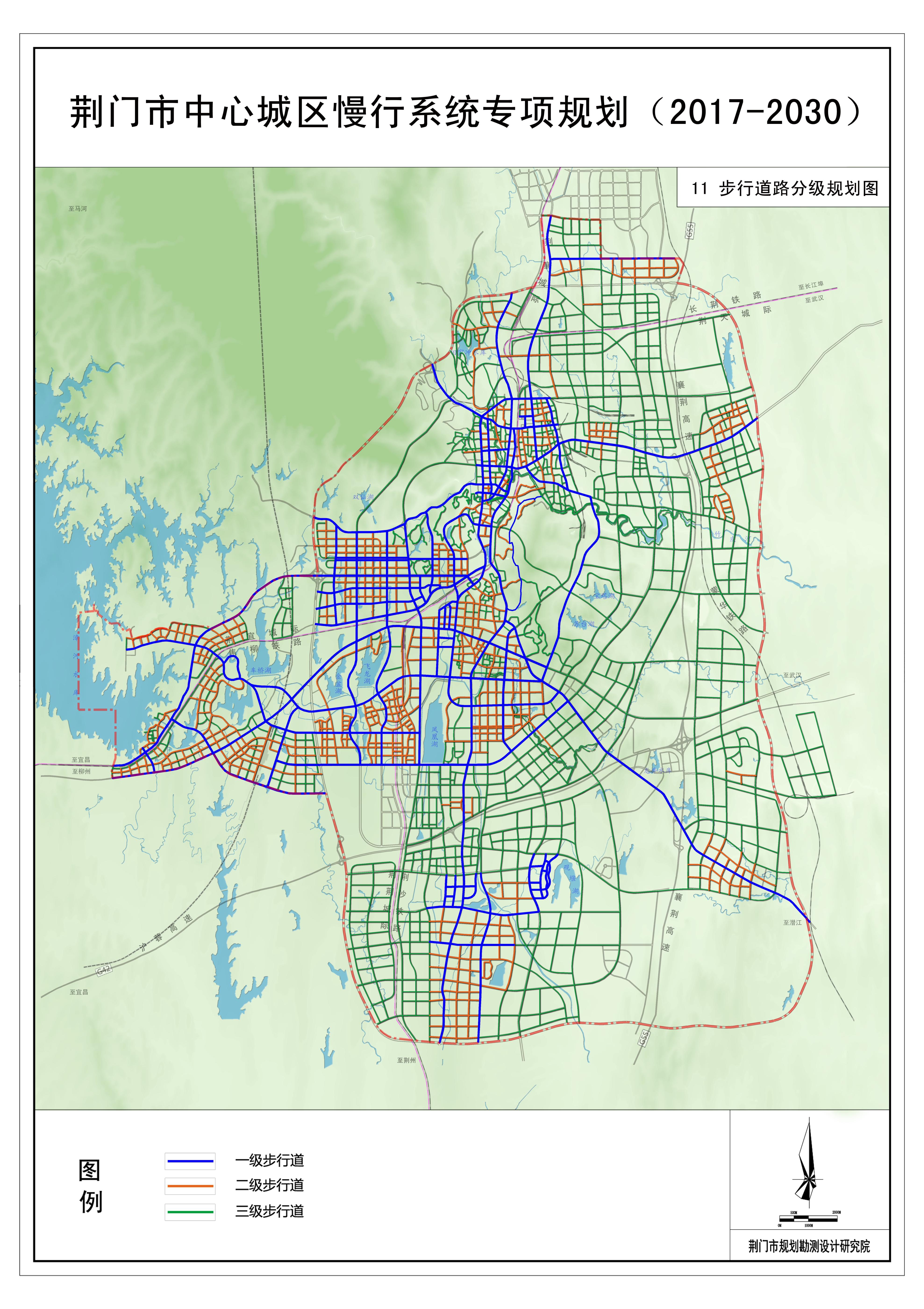 (2)城市步行道路网规划:规划将道路两侧布置的步行道划分为三级。
